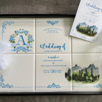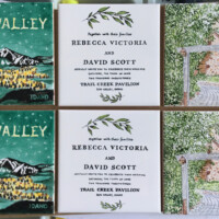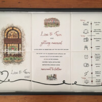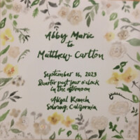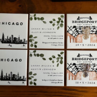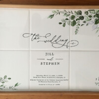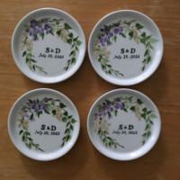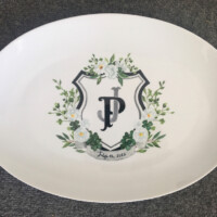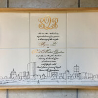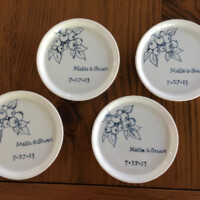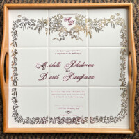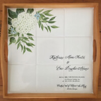 Sharon Harrison uses the clients custom wedding invitation and/or wedding invitation suites and creates a unique keepsake on tiles or porcelain platter depicting the important elements from the invitation. After firing, if created on tile, the tiles are inserted into a wooden tray. Each work of art is unique and becomes a lifetime keepsake for the bridal couple.