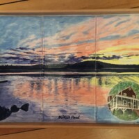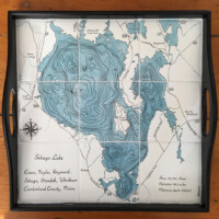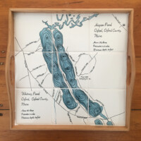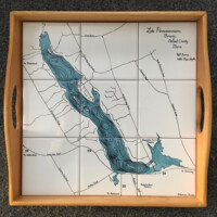 Using Nautical or Google maps of specific lakes, islands or bodies of water, Sharon Harrison recreates the images on tile. Specific meaningful details can be highlighted on the tiles, i.e. name of home or campsite, roads, island, towns etc. The tiles can then be inserted into a wooden tray or framed for hanging on the wall.